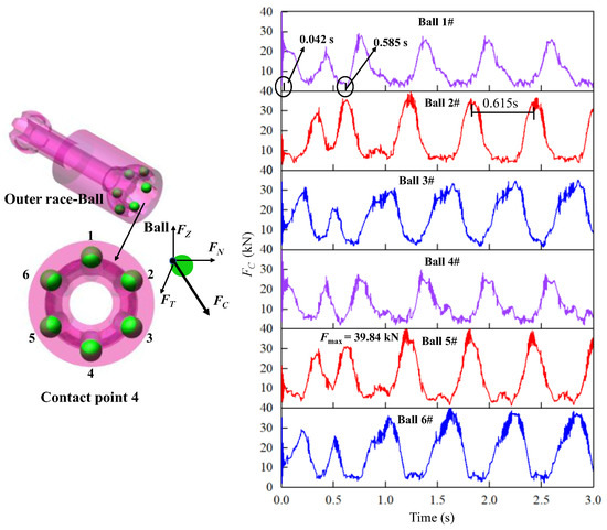 Figure 11 shows the variation of contact force between the groove of the outer race and the six ball keys (contact point 4). The contact force between the outer race and ball keys shown in the Figure 11 is the result of the normal contact force , axial contact force , and tangential contact force . The collision contact force shows obvious periodicity, and its motion period is 0.61 s (frequency is 1.63 Hz). The peak value of contact force on 2# ball key and its symmetrical 5# ball key at the inner side of the deflection is the largest, which is 39.84 kN.