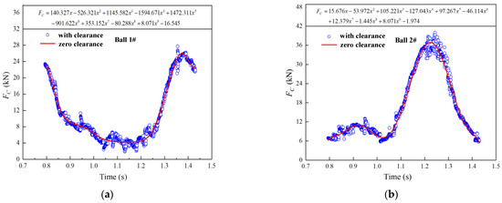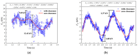 Researchers [29,30] believe that the oscillation of the collision contact force is mainly caused by the hinge clearance, and large clearance can lead to fewer collisions at the hinge, which can make the peak value of contact force higher. When the collision is stabilized, the contact force shape function can be obtained by fitting the normal contact force and axial contact force at the ball cage by using ninth-order polynomials during a certain time period. The fitting function is shown in Figure 13, and the selected time periods are from 1.18 s to 1.82 s (normal contact force) and from 1.52 s to 2.75 s (normal contact force), respectively. The force obtained by fitting can be regarded as the contact force on the cage without clearance and then comparing with the discrete point shown in Figure 13, the influence of clearance on contact force oscillation can be studied.