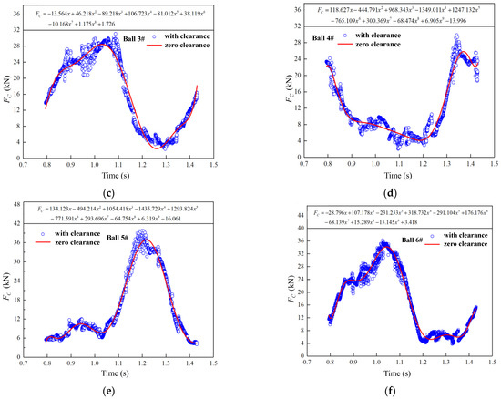 Figure 14 shows the variation of contact force between six ball keys and the ball seat with or without clearance. Due to the high coincidence between the ball seat groove and the ball key in geometry, the clearance between them is smaller than that between cage and ball seat. Compared with the results shown in Figure 13, the oscillation amplitude of contact force is smaller, and contact force error between the fitting curve and discrete point is also smaller. The results shown in Figure 13 and Figure 14 indicate that the large clearance leads to the large amplitude vibration of contact force and causes large error of contact force.