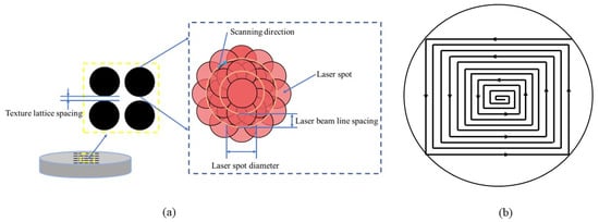 The surface texture of the sample is processed by laser using the scanning strategy shown in Figure 1. Figure 1a shows the theoretical processing method, where overlapping of laser spots occurs when the distance between laser beam lines is smaller than the diameter of the laser spot, otherwise they will not. Under high magnification, some of the textures produced by the processing appear as polygons. This is because the galvanometer scanning system control software employs an annular filling method, as shown in Figure 1b. As a result, the laser path is automatically fitted from polygons to circles when processing the texture.