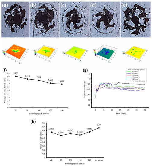 Texture morphology of sample surface at different scanning speeds. (a) 60 mm/s, (b) 80 mm/s, (c) 100 mm/s, (d) 120 mm/s, (e) 140 mm/s, (f) average depth of textures processed at different scanning speeds, (g) variation of friction coefficient with time at different scanning speeds, and (h) the friction coefficient of stable wear at different scanning speeds.