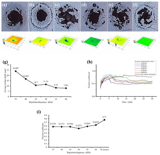 Texture morphology of sample surface at different repetition rates. (a) 35 kHz, (b) 40 kHz, (c) 45 kHz, (d) 50 kHz, (e) 55 kHz, (f) 60 kHz, (g) average depth of textures prepared at different repetition rates, (h) variation of friction coefficient with time at different repetition rates, (i) the friction coefficient of stable wear at different repetition rates.