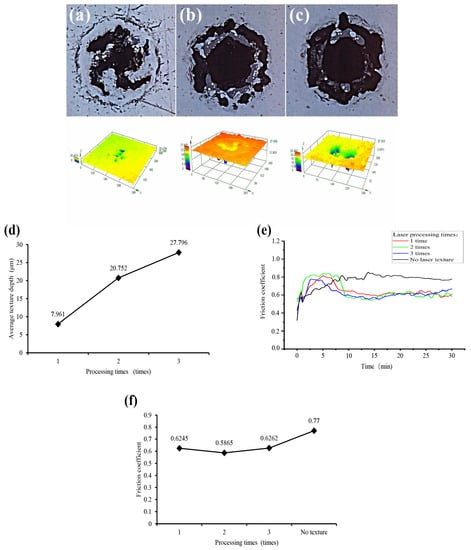 Based on the first groups of investigations, groups 11–12 used different processing times to texture the samples. By observing the texture morphologies under the super depth of field microscope, as displayed in Figure 4a–c, it was found that as the processing times increased, the sum of laser energy acting on a certain point increased, the amount of removed material increased, and the average texture depth increased as well. This was consistent with the average texture depths experimentally measured and displayed in Figure 4d. The average texture depth increased with the number of processing times. The trend of the friction coefficient of the material surface over time at various processing times is shown in Figure 4e, showing that the friction coefficient was very high at the initial wear stage. This is because at the beginning of grinding, there is still a small amount of residual molted material on the surface, resulting in excessive surface roughness. After 15 min, the friction coefficient gradually decreased and stabilized when entering the stable wear stage. This is because the texture acts as a trap for impurities such as abrasive dust, reducing the surface roughness of the substrate material while reducing abrasive wear on the surface of the substrate material. As shown in Figure 4f, the friction coefficient measured during the stable wear stage was the smallest (0.5865) when processed twice. Increasing the amount of processing times could increase the texture depth and decrease the friction coefficient, but too many processing times could increase the thickness of the recast layer, increasing the friction coefficient. Therefore, when the processing times were 2, the texture of the prepared surface minimized the friction coefficient of the material surface and optimized the anti-friction properties of the material.