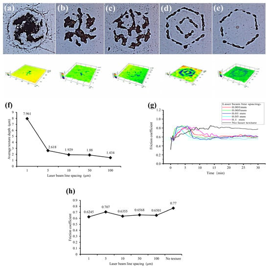 Texture morphology of sample surface under different line spacing. (a) 1 μm, (b) 5 μm, (c) 10 μm, (d) 50 μm, (e) 100 μm, (f) average depth of textures prepared with different line spacing, (g) change of friction coefficient with time under different laser beam line spacing conditions, (h) friction coefficient of stable wear at different line spacing.