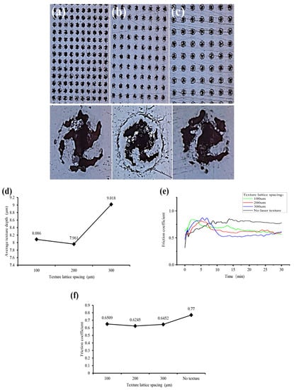 Surface morphology of samples with different textural lattice spacing. (a) 100 μm, (b) 200 μm, (c) 300 μm, (d) the average texture depth was prepared with different lattice spacing, (e) variation of friction coefficient with time under different lattice spacing, (f) friction coefficient of stable wear at different lattice spacing.