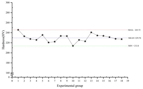 In this test, the hardness of the material surface before and after processing the texture was measured and compared using a micro-Vickers hardness tester. The hardness of the material surface before processing the texture was 228.6 HV using the method of multiple measurements at multiple locations and taking the average value, and the hardness of the material surface after processing the texture was about 228.6 HV. Using the same method, the hardness of the different texture surfaces processed under various laser parameters was measured at around 229.70 HV, with a maximum value of 245.73 HV and a minimum value of 213.80 HV, as shown in Figure 7. The hardness of the material surface did not change significantly before and after the processing of the weave, indicating that the weave studied in this test did not cause significant changes in the hardness of the material, which in turn did not affect the frictional wear performance of the sample.