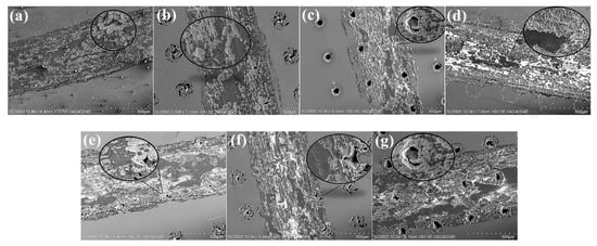 As shown in Figure 8a, adhesive wear and fatigue wear were the main types of wear for the nontextured surface. In Figure 8b,d,e, the overall depths of the textures were small, the texture surfaces were not very large, and there were more scaly fragments than pits, indicating that the adhesion wear was dominating. Figure 8c,f,g showed that the pits were in the majority, indicative of fatigue wear. Figure 8c,e show that the textures collected some debris. In summary, the added surface textures could collect debris during friction, thereby reducing the occurrence of abrasive and adhesive wear and thus the degree of wear.