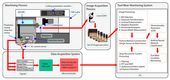 Considering the foregoing, the main contribution of this research is the development of a system for the detection of the level of wear in cutting tools used in a CNC lathe by analyzing the information obtained directly from the spindle motor of the machine using non-invasive current and stray flux sensors, as well as from images of the surface finish of the machined parts. The proposed system allows the analysis of the signals individually and together, allowing it to be adapted to the user’s needs to evaluate the wear online or after the process is finished, all through the use of the fast Fourier transform (FFT), the discrete wavelet transform (DWT), statistical and non-statistical indicators, dimensionality reduction by linear discriminant analysis (LDA) and a feed-forward neural network (FFNN) for wear classification under the individual variations of the cutting speed and the feed rate of the tool.