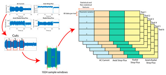 3] employed an MCSA to generate an online system from the spindle motor current with a bispectrum signal modulation (BSM) algorithm by identifying the magnitude and phase of the BSM to distinguish between the effects of three levels of wear upon changes in the depth of cut and workpiece diameter of an A3 steel piece, although only one of the obtained features could identify the wear for each depth of cut. On the other hand, Marani et al. [