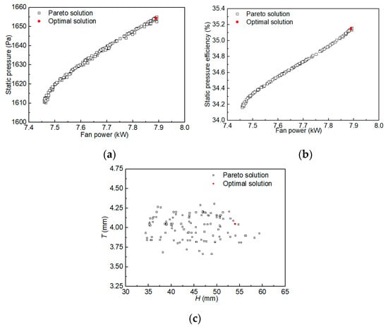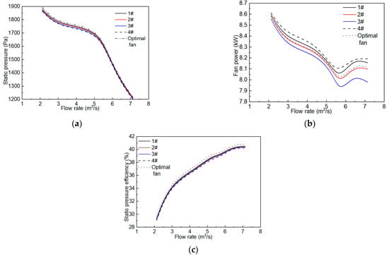 - The RSM method based on DOE was creatively applied to the shape optimization design of the guide fin. Compared with the cooling fan without guiding fins, the static pressure increased by 9.5%, the power loss increased by 1.7% and the static pressure efficiency increased by 7.6% for the optimized cooling fan. The optimization results were verified to prove the feasibility of the idea.