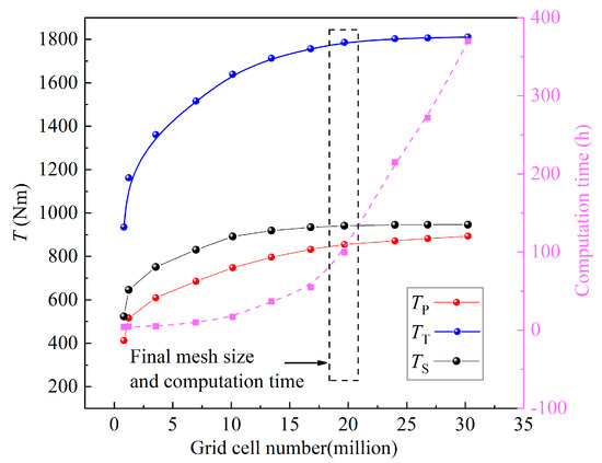 The accuracy and efficiency of the solution are directly affected by the mesh density. In theory, a higher grid number would yield better accuracy. However, a huge mesh number requires higher computing resources. Therefore, an appropriate mesh density should be determined by mesh independence analysis to achieve a proper balance between accuracy and computing cost, and the mesh model is considered independent if further refining the mesh produces less than 3% variation in results. A mesh independence test with WALE model was performed with different mesh resolutions; the reference pressure level was 0.4 MPa, the pump speed was 2000 rpm, and the turbine speed was fixed at 20 rpm. Figure 3 and Table 3 shows the torque results of the pump, the turbine and the stator over variant mesh densities through the CFD calculation. Considering the computational efficiency and accuracy comprehensively, the element numbers of the pump, the turbine and the stator are 7,538,148, 6,319,448 and 5,442,091 respectively, and the pump torque variation is 2.73%, which satisfies the requirement for mesh independence.