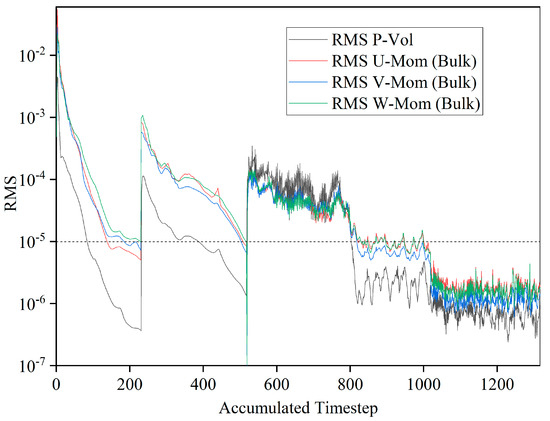 The convergent results of the generated mesh show that the numerical results converge to RMS < 1 × 10−5 (Root Mean Square) quickly, with WALE model in stall condition (SR = 0.01), as shown in Figure 4.