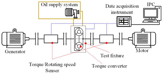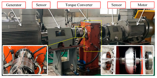 Two high-power motors were adopted as the torque converter input (300 kW) and the loading device (500 kW). The speed and torque sensors were installed at the input and output ends of the torque converter, respectively, with a calibration accuracy of 0.5%. The torque converter test fixture was supplied with oil by an independent hydraulic pump station system, which can realize the adjustment of the charging oil pressure at the inlet and outlet. The inlet and outlet of the torque converter were equipped with high-precision pressure and temperature sensors, which can monitor the oil conditions during operation. The structure of the test bench is shown in Figure 5 and Figure 6.