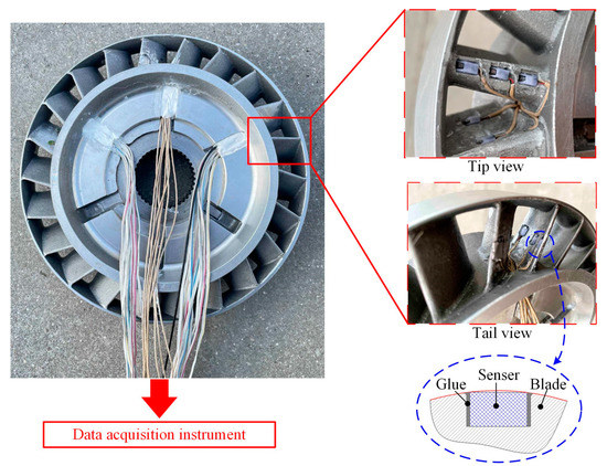 Based on the performance test system of the torque converter, the stator blade surface pressure measurement system was established and shown in Figure 7. The sensor installation slots were cut on the surface of the tested stator blade, and the ultra-small dynamic pressure sensors and the wires were fixed in the slot with glue to avoid interference with the main flow. The gaps were filled with glue to ensure the tightness and smoothness of the installation. In order to reduce the interference of ambient signals, low-impedance conductors with frequency closed layers are applied, and the voltage signal is led to the signal collection device and converted into a dynamic data-to-pressure value signal [41]. The measurement accuracy of the dynamic absolute pressure signal of the sensor is higher than ±0.1%.