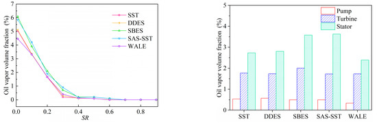 From the total volume fraction of the vapor bubbles in the flow field at different speed ratios in Figure 10, it can be seen that the cavitation bubbles occur under low SR range and vanish when SR is higher than 0.4, and the cavitation degree reaches its maximum when stalling (SR = 0.01). Thus, the following sections mainly analyze the flow field under the stall operating condition. The results show that simulated vapor volume values of the SBES and SAS-SST models are larger than those of the SST, DDES and WALE models under usual operating conditions. SST, DDES and WALE predictions show that the maximum vapor volume fraction drops below 10% when SR is higher than 0.3, indicating the dissidence of cavitation. However, SBES and SAS-SST results show that cavitation will not disappear until SR is higher than 0.4. When stalling, SBES and SAS-SST models also show a higher vapor volume fraction in the stator domain than the other models.