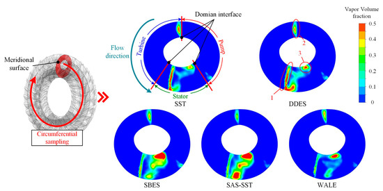In order to characterize the overall distribution of cavitation vapor in the flow field, the vapor volume fraction was averaged and shown in meridional surface. As in Figure 11, it can be found that for all turbulence models, the cavitation vapor is mainly distributed at the middle of the blade tip in the turbine and stator (area 1), and a small amount of vapor is distributed in shroud side of blade tip in the pump (area 2). However, different cavitation regions were determined by the selected turbulence models. The SST and DDES models show that vapor became centralized at the stator blade tip. As for the SBES, SAS-SST and LES models, the vapor is mainly distributed at hub side area of blade tail (area 3).