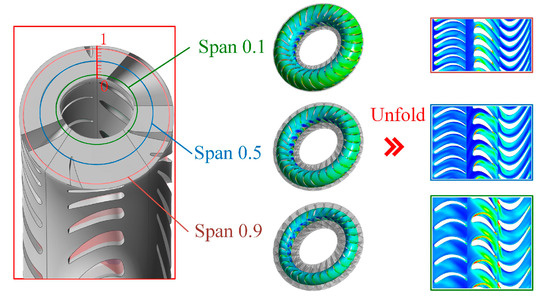 (2) The time-averaged simulation results of transient cavitation flow fields in the three impellers using different turbulence models show similar overall distribution laws. The most serious cavitation occurs in the stator, followed by turbine and pump. The difference in the occurrence of cavitation is closely related to the distribution of eddy viscosity in the flow field and the characteristics of the vortex structure. The ability of the SRS model to capture the vortex structure improves its cavitation prediction accuracy.