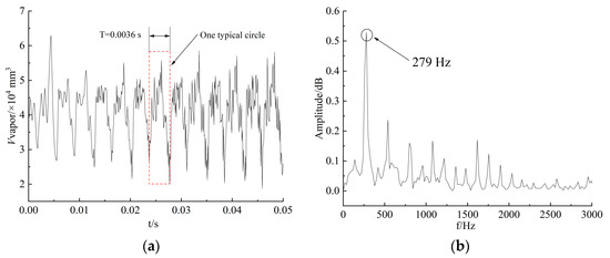 Variations in the vapor volume of the stator in the time and frequency domain (SR = 0.01): (a) vapor volume, (b) vapor volume spectrum.