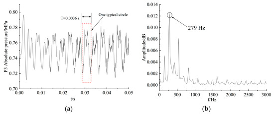 Variations in the absolute pressure of the P3 measuring point in the time and frequency domain (SR = 0.01): (a) absolute pressure, (b) absolute pressure spectrum.
