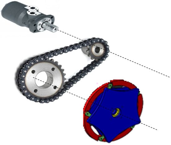 The hydraulic motors driving the wheels are fixed to the vehicle chassis. As can be seen in Figure 3, the rotational motion is transferred to the wheels by using a simple toothed chain system with a reduction ratio of 1/2.