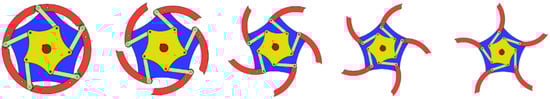 The positions of the five fingers of each of the six wheels are calculated with the same equations, but the parameters a and d are variable. The changes in the signs and values of the a and d parameters are summarized in Table 4.