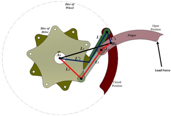 The four-bar mechanism on each finger allows the wheel mechanism to be opened. Figure 5 shows the structure of a single finger’s four-bar mechanism in order to make it easier to understand. represents the wheel disc in the open finger position, and is the fixed component of the four-bar mechanism. It is represented by the rotating middle disk member , the connecting rod member and the finger member . The four-bar mechanism’s moving parts are , , and . These notations , , and are stated with exponential quotation marks in the second position of the finger with the finger open.