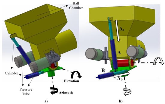 The elements used in the shooting turret mechanism are given in Figure 6a. Hydraulic cylinders were used for the circular movements of the shooting turret in the azimuth and elevation axes. The pressure required to launch the fire extinguisher balls into the turret chamber, however, is provided by pressure tubes. In Figure 6b, the details of the movement mechanism are given. The displacement Δa made by the cylinder A in the figure along the axis direction provides the circular movement of the tower in the elevation axis. In addition, the displacement Δb made by the B cylinder along the axis direction provides the circular motion of the tower in the azimuth axis.