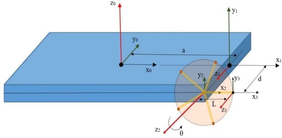 The design and dimensions in the three-dimensional model are used to generate the robot’s mathematical model. Assume that the robot’s length is 2a and its width is 2d. The finger length on the wheel is taken as L. The angular displacement of the rotate wheel is denoted by θ. The fingers are positioned at equally spaced angles with respect to the wheel center. In order to write the position expressions of the fingertips of each wheel, the axis set in the middle of the robot body was taken as reference and the Denavit–Hartenberg method was used. Figure 7 shows the arrangement of axes on the robot.