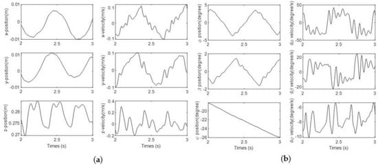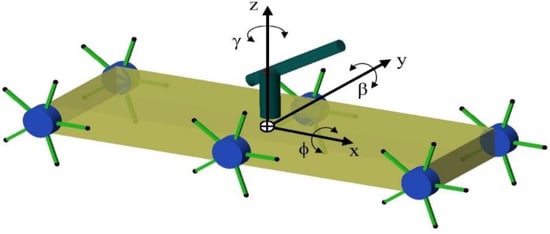 For the 3-axis independent rotation movements of the robot, Euler angles defined as in Figure 8 are used. The rotational motion of the robot around the x-axis is expressed as , the rotational motion around the y-axis is expressed as and the rotational motion around the z-axis is expressed as (Equations (10)–(13)). Accordingly, the rotational transformation matrix of any point on the robot can be obtained with Equation (14).