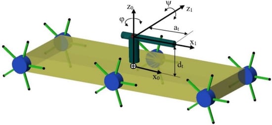 The link table necessary for the first finger was obtained by considering the wheel in the robot’s front right corner, as shown in Table 3. The first finger is supposed to be positioned at zero degrees relative to the wheel center. The other fingers are placed at 72°, 144°, 216°, 288° positions, respectively, from the wheel center.