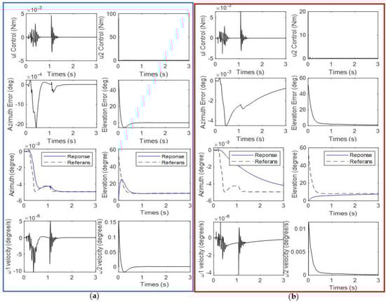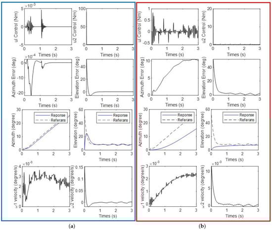 Control signals, error values, trajectory and velocity of Turret System elevation and azimuth motor with (a) SMC (b) PID controllers for Scenario 2.