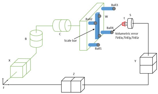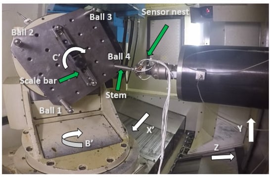Figure 1 illustrates the experimental setup. Four separate artefact balls are fixed on stems with different lengths and a scale bar made of Invar with two balls separated by a calibrated distance on the workpiece side, while the sensor nest is mounted in the spindle on tool side.