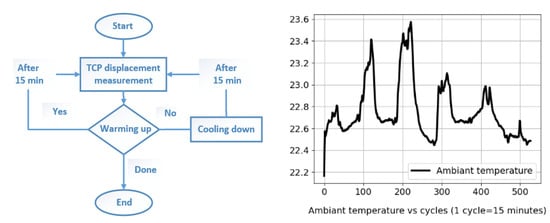 The activity sequences are implemented using a machine tool G-code. TCP positions are measured at 15 min intervals for both training and testing processes. TVEs, estimated by the Scale And Master Ball Artefact (SAMBA) method [