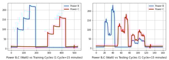 Figure 3 on the left shows the long process of activity with different measured powers of the B and C rotary axes lasting 132 h. In this process, each axis is exercised separately to capture their individual effect on the behavior of the machine tool.