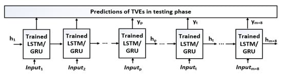 Figure 9 shows the testing procedure applying multistep predictions with the trained SLSTMs/SGRUs and inputs without using measured TVEs as targets. In this phase, to match the initial conditions, eight first states with values of zeros are added to the data sequence, as Ngoc et al. conducted this in [