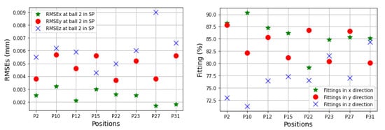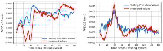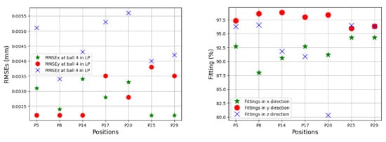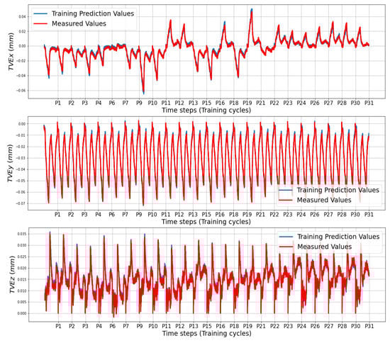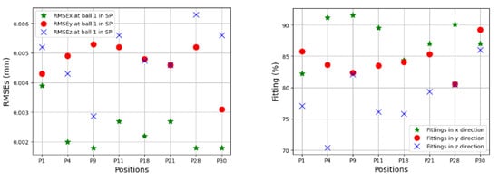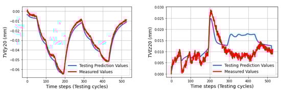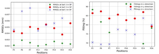 s in 33 linear axis positions with directional components of TVEx, TVEy, and TVEz at one cycle in the testing process. Predictions of TVEs of seven positions at ball 4 in the long process can reach very high fitting with RMSE = 2.2 μm (fitting = 98.8%) for TVEy14, while the lowest proportion of fitting in this process is for TVEz20 with RMSE = 5.6 μm (fitting = 80.3%).