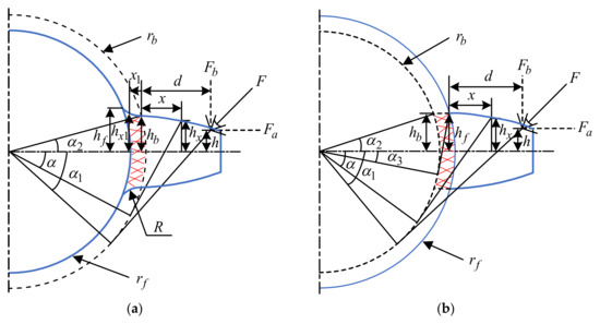 The number of teeth of the gear where the crack is located is 90 teeth, so the case that the dedendum circle is larger than the base circle is considered. Because the crack does not change the length of the gear contact line, the Hertz contact stiffness does not change. In addition, the gear can still bear axial compression force after the root cracks, so it can be considered that the axial compression stiffness will not change. In this paper, it is assumed that there are two stages of crack growth as shown in Figure 4. Figure 4a shows the initial stage of crack growth, and Figure 4b shows the more serious stage after crack growth [21].