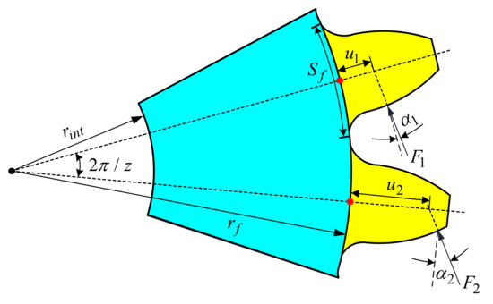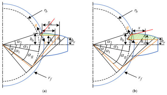 According to the principle of gear, the relative positions of the dedendum circle and the base circle are not fixed, which means the integral interval needs to be handled in different cases [21]. The radii of the base circle and dedendum circle can be expressed as follows: