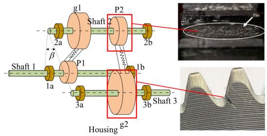 Gears are important components of transmission systems and have been widely used in various items of large mechanical equipment, industrial production and military industries due to their precise transmission ratios, long service life and high reliability. However, they may fail over time due to the inevitable fatigue that occurs in gear systems under heavy loads and harsh working conditions [1]. Inadequate lubrication and overloading can cause deformation, which can lead to wear, cracking, pitting, spalling and even tooth breakage, directly affecting the safe operation of equipment. Particularly in some large-scale engineering fields, gear failures often cause huge economic losses and threaten the safety of people and property [2]. Therefore, it is particularly important to study the mechanism of gear failure [3,4]. The more common forms of gear failure are cracking and pitting [5]. Cracking occurs mainly at the tooth root during the meshing process, while pitting occurs on the tooth surface. However, whether pitting or cracking occurs, it will damage the surface material, reduce the gear teeth’s effective cross-sectional area, change the gears’ meshing stiffness and ultimately affect the dynamic characteristics of the gear system [6].