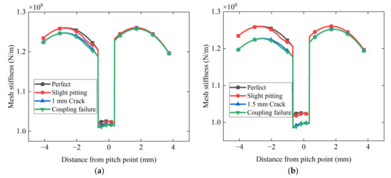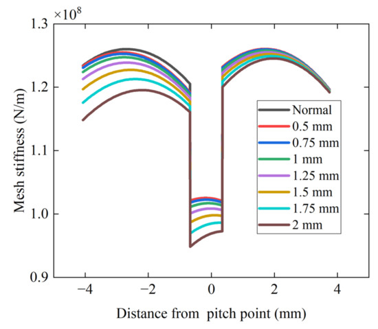 Figure 11a–c describes the mesh stiffness of gear coupling cracks of three depths (1 mm, 1.5 mm and 2 mm) with slight pitting. The coupling mesh stiffness is lower than the single-fault mesh stiffness and approaches the crack stiffness. After the crack depth exceeds 1.5 mm, the stiffness decreases significantly. From these figures, it can be concluded that during the slight pitting stage the coupling fault behaves similarly to a single crack fault. This is because during the slight pitting stage the material peeling on the tooth surface is relatively small, and its effect on the comprehensive mesh stiffness is smaller than that of the crack. However, the features of pitting stiffness can still be observed in the coupling stiffness, which exhibits irregular fluctuations.