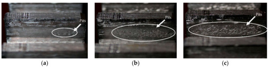 Pitting gear teeth: (a) Pitting extending area: 6.3%; (b) Pitting extending area: 27.8%; (c) Pitting extending area: 41.7%.