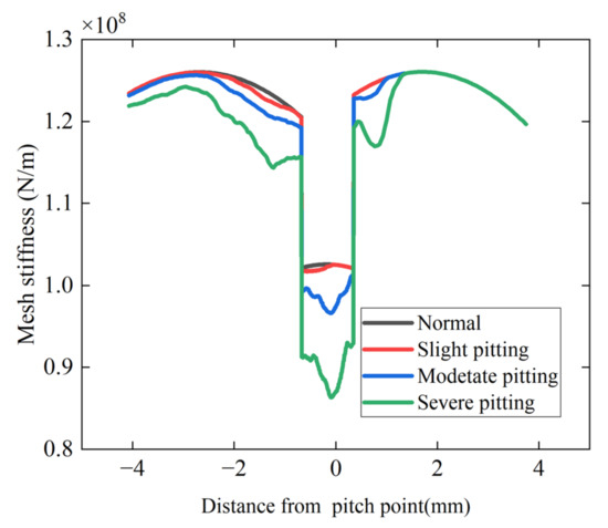 Influence of pitting degree on time-varying meshing stiffness of gears.