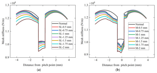 In this study, it is assumed that the driving gear has pitting. In contrast, the driven gear has cracks, resulting in two types of gear fault situations during the meshing process, as shown in Figure 9. When two faulty gears mesh, their comprehensive meshing stiffness is calculated using Equation (16). The calculated results of the composite fault stiffness are shown in Figure 9, Figure 10, Figure 11 and Figure 12. In this paper, the crack degree is expressed by its propagation depth, q = 0.5 mm, 0.75 mm, 1 mm, 1.25 mm, 1.5 mm, 2 mm. The degree of pitting is expressed as slight (SL), moderate (M) and severe (Se).