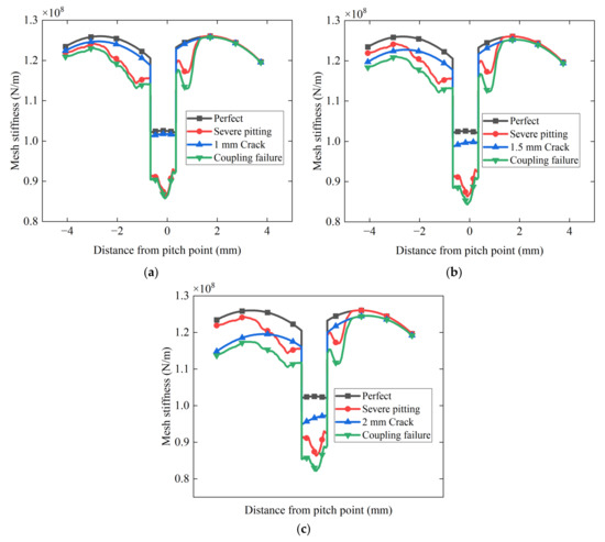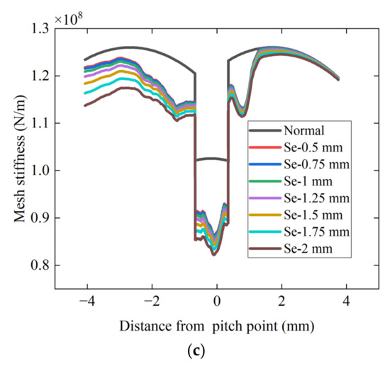 The crack effect on meshing stiffness with severe pitting: (a) At the stage of 1 mm crack; (b) At the stage of 1.5 mm crack; (c) At the stage of 2 mm crack.
