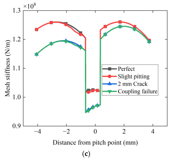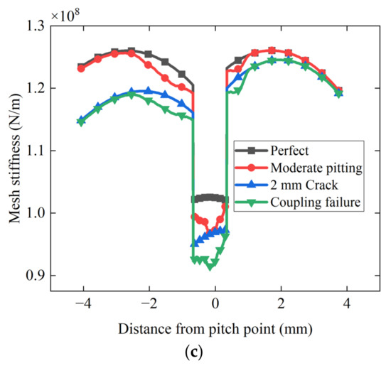 The crack effect on meshing stiffness with moderate pitting: (a) At the stage of 1 mm crack; (b) At the stage of 1.5 mm crack; (c) At the stage of 2 mm crack.