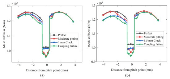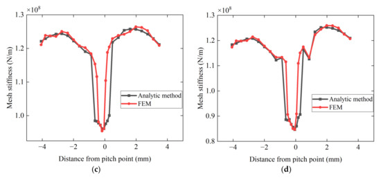 Comparison of stiffness calculation results: (a) Normal tooth condition; (b) Slight pitting and 0.5 mm crack condition; (c) Moderate pitting and 1 mm crack condition; (d) Severe pitting and 1.5 mm crack condition.