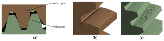 Fault gear meshing: (a) Meshing gear pair; (b) Gear with crack; (c) Gear with pitting.