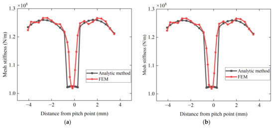 The comparison between the stiffness obtained from the proposed method and the results from finite element simulations is shown in Figure 15. The comparison shows that both the proposed method and the finite element method produce consistent results in the double-tooth meshing area for both normal and faulty gears. However, there are some differences between the two methods in the single-tooth meshing region. This is because, in the actual meshing process, there is a phenomenon of tooth engagement advance and tooth disengagement lag due to the deformation of the gear teeth, resulting in a decrease in the carrying time of the single-tooth area. Nevertheless, the results indicate that the proposed method and the finite element method are consistent in terms of numerical values and trends, demonstrating the proposed method’s effectiveness in calculating the stiffness.