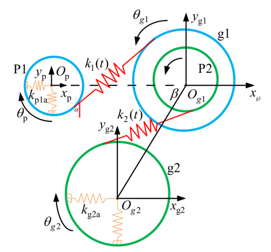 where mp, mg is the mass of the driving and driven wheels, respectively, Izp, Izg are, respectively, the moment of inertia of the driving and driven wheel around the z axis, Cs is the damping of the meshing element and ks(t) is the time-varying meshing stiffness of gears.