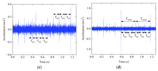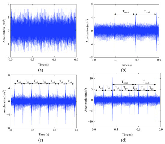Simulated acceleration signals of gear systems with different faults: (a) Normal gear system; (b) Gear system with cracks; (c) Gear system with pitting.; (d) Gear system with cracks and pitting.